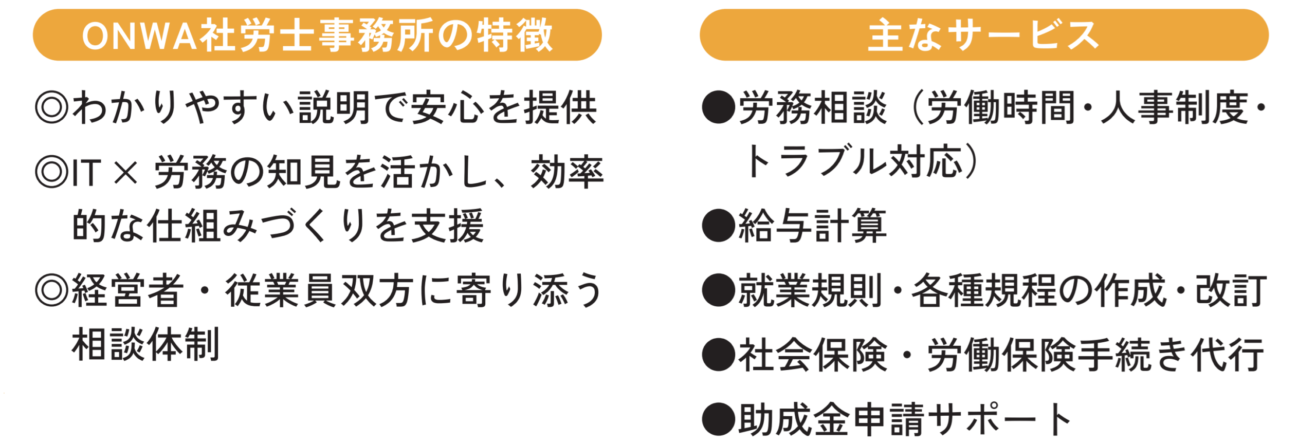 ONWA社労士事務所では、企業と人が安心してつながるためのサポートを行っています。 「人を雇うって、こんなに複雑だったの?」という不安や、「制度は整えたいけど、何から始めればいいの?」という悩みに、やさしく、ていねいに寄り添います。
